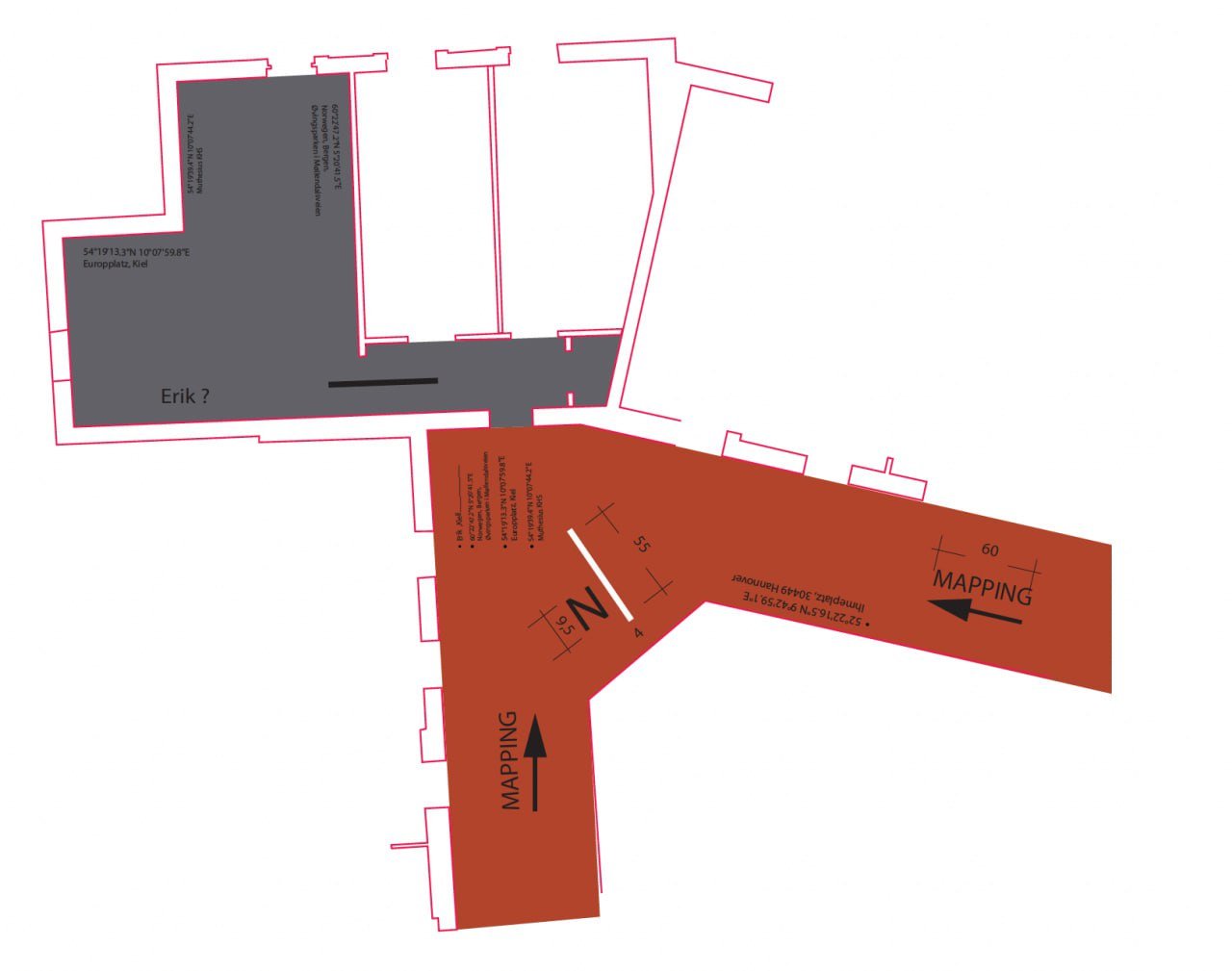 Mit meiner Mapping-Methode befreie ich eine Schwarzplanzeichnung und eine Ansicht aus ihrem statisch, grafischen Zustand. Diese Methode basiert auf meiner Ortsanalyse und Interpretation eines Nicht-Ortes während meines Erasmus-Aufenthalts 2022-23 in Bergen, Norwegen. Während dieser Zeit beschäftigte ich mich intensiv mit Fragen wie: Welche Orte braucht es, um kreativ und innovativ zu sein? Welche Strategien, Gebäude, öffentlichen Plätze, Innenräume und Landschaften inspirieren, fördern das Arbeiten, gestalten und motivieren? Norwegen, ein Ort mit kontrastreicher Umgebung, atemberaubender Natur und vielfältiger Landschaft, hat meinen Adventure-Kalle erweckt und mir das Gefühl gegeben, in einer Umgebung zu sein, die keinerlei Ordnung bzw. einer "wilden" und "natürlichen" Ordnung folgt. Diese Erfahrungen haben mich dazu inspiriert, im architektonischen Kontext den Wunsch nach Dekonstruktion und dem Brechen von glatter, ordnungsorientierter Architektur und Design selbst zu verfolgen. Immer wieder suche ich nach Imperfektion, Unfertigem und Vermeintlichem in der Stadt. Breaking the rules, being chaotic, a desire for wild growth.